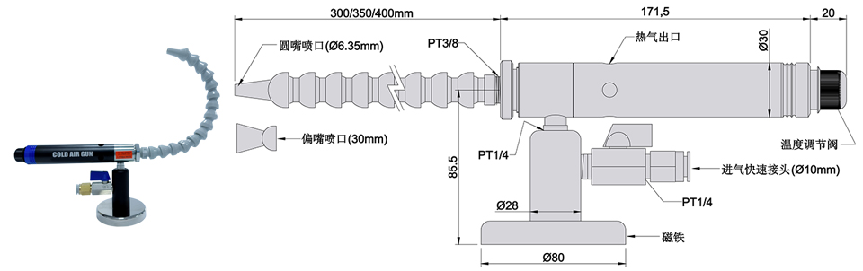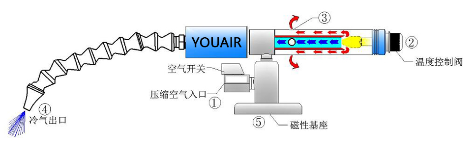 YOUAIR可調(diào)式冷卻槍利用渦旋管將普通壓縮空氣變成冷熱兩股低壓氣流。熱氣流經(jīng)抑制器反射,部分從熱氣出口3排出。冷氣流從萬(wàn)向軟管4排出,該柔軟管即直接指向需冷卻的部位,立即冷卻發(fā)熱部件。冷卻槍帶一個(gè)磁性基座5,非常易于??烧{(diào)式冷卻槍設(shè)置有溫度控制閥旋鈕2,旋鈕逆時(shí)針旋轉(zhuǎn)時(shí)調(diào)低冷空氣溫度,此時(shí)冷氣溫度會(huì)降低,冷空氣流量會(huì)減少,順時(shí)針轉(zhuǎn)動(dòng)旋鈕冷氣溫度會(huì)升高,流量會(huì)變大。