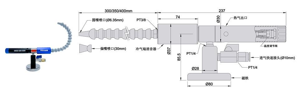 YOUAIR可調(diào)式冷卻槍利用渦旋管將普通壓縮空氣變成冷熱兩股低壓氣流。熱氣流經(jīng)抑制器反射,部分從熱氣出口3排出。冷氣流從萬向軟管4排出,該柔軟管即直接指向需冷卻的部位,立即冷卻發(fā)熱部件。冷卻槍帶一個磁性基座5,非常易于??烧{(diào)式冷卻槍設(shè)置有溫度控制閥旋鈕2,旋鈕逆時針旋轉(zhuǎn)時調(diào)低冷空氣溫度,此時冷氣溫度會降低,冷空氣流量會減少,順時針轉(zhuǎn)動旋鈕冷氣溫度會升高,流量會變大。
